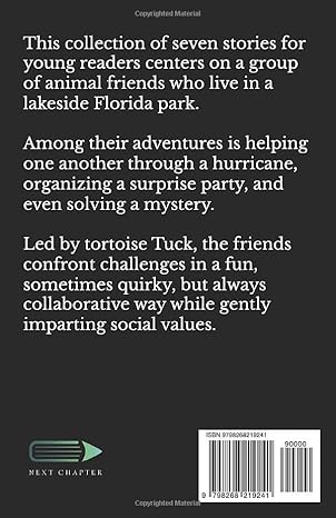 This collection of seven stories for young readers centers on a group of animal friends who live in a lakeside Florida park. Among their adventures is helping one another through a hurricane, organizing a surprise party, and even solving a mystery. Led by tortoise Tuck, the friends confront challenges in a fun, sometimes quirky, but always collaborative way while gently imparting social values.